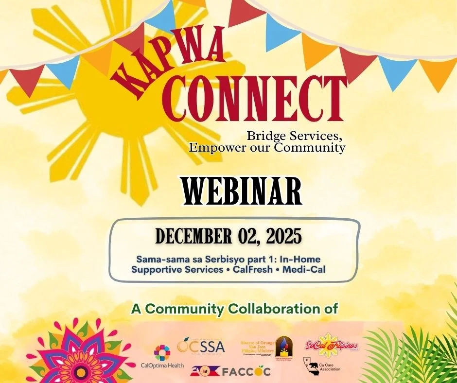 This two-part webinar series, hosted by the Ca Care Association in collaboration with the Orange County Social Services Agency, is designed to provide essential guidance for Filipino caregivers and care providers on successfully navigating critical public benefits. The Orange County Social Services Agency will focus on explaining programs such as In-Home Supportive Services (IHSS), along with resources like CalFresh. The goal is to ensure that the caring community can access the full spectrum of support for both themselves and their clients. the webinar will be on December 02 from 9:00 AM to 10:00 AM Pacific Time (California Time).